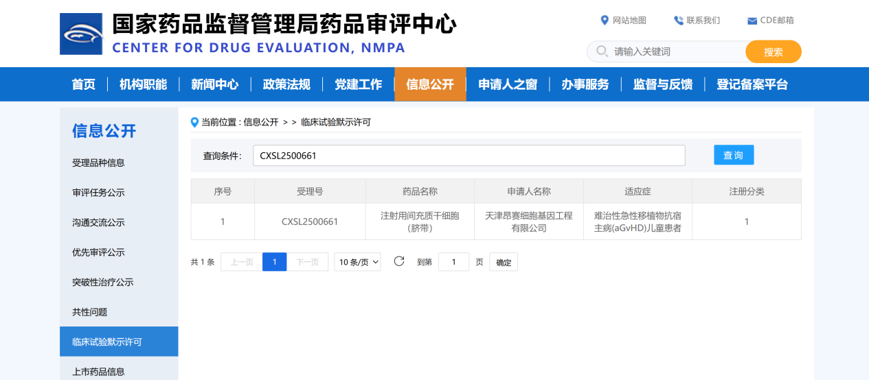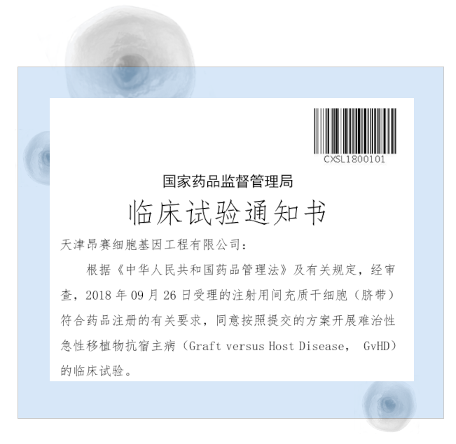 2025年11月3日, 天津昂賽細胞基因工程有限公司申報的注射用間充質干細胞(臍帶)治療難治性急性移植物抗宿主?。╝GvHD)兒童患者的適應癥獲得國家藥品監督管理局臨床試驗默示許可